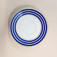 BERNARDAUD Limoges pour PETROSSIAN Paris : Suite de 6 tasses à café et leurs 6 soucoupes en porcelaine blanche à décor de rayures marine et filets or. Signatures sous la base. Haut. tasse 6 cm. Diam. soucoupe 13,5 cm. TBE. On y joint 4 soucoupes BERNARDAUD modèle SOLARIS en porcelaine polychrome pouvant faire office de petites assiettes à biscuits ou chocolats afin d'accompagner le café. Diam. 10,1 cm. TBE.