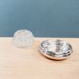 CHRISTOFLE, XXe siècle, production moderne : Pique-fleur rond en métal argenté, la doublure en cristal moulé (doublure non signée). Signé. Poinçon post 1983. Diam. 12 cm. H. 6.3 cm. Légères rayures. TBE général. On y joint un dessous de bouteille en verre moulé étoilé à monture en métal argenté. Sans signature ni poinçon. Diam. 10 cm. TBE.