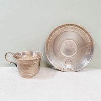 Lot de 6 pièces en argent et argent fourré 950 mil, fin XIXe début XXe siècle comprenant : - 2 tasses à café et leurs soucoupes, l'une guillochée de croisillons et d'ondes (H. 5,3 cm, diamètres : 7,7 et 13,5 cm), l'autre à guirlandes de feuillages et frises d'oves (H. 6 cm, diamètres : 6 et 11,7 cm). Toutes deux à cartouches non chiffrés, Minerves et poinçons LG avec un cheval . Usures d'usage, minuscules coups. - 1 coquetier tripode de style rocaille à vagues déchiquetées, cartouches non chiffrés et fleurettes. Minerve et poinçon LC. H. 4,6 cm. BE. - 1 cuiller pour fruits au sirop ou olives en argent, spatule violonée à agrafe florale, le cuilleron repercé. Minerve et poinçon de maître difficilement lisible (Gallon ?). L. 19,7 cm. Très légère déformation. BE. - 1 cuiller saupoudreuse, le manche en argent fourré à feuilles de laurier, agrafe feuillagée et cartouche nonchiffré. Le cuilleron en métal doré repercé. Minerve et poiçon de maitre PE avec des ailes. L. 15,7 cm. BE. - 1 pelle à sucre, le manche en argent fourré violonné à fleurettes et feuillage. Le cuilleron en forme de feuille gravée de fleurettes et croisillons rocaille. Minerve et poinçon de maître ARD. L. 16,6 cm. Usures à la dorure. Poids total brut : 385,5 g.