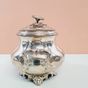 MASSAT Frères, XIXe siècle, Second Empire : Sucrier couvert en argent 950 mil, modèle à côtes pincées et anses feuillagées reposant sur 4 petits pieds à enroulements, cuirs et agrafes feuillagées. Le couvercle à prise en forme de fleur épanouie. Chiffré "DB". Poinçon ante 1983, poinçon de maître. Poids. 397,5 g. Long. aux anses : 16 cm. Haut. 14 cm. TBE.