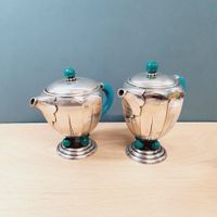 Service à thé-café de 4 pièces ART DECO en métal argenté comprenant 1 cafetière couverte (H. 20 cm), 1 théière couverte (H. 17,5 cm), 1 pot à lait (H. 10 cm), et 1 sucrier (9 cm). Modèle à pans, le piedouche à moulures de doucines surmonté comme le couvercle de boules de verre turquoises, les anses en bois peintes en turquoise. Poinçon de maître SC avec une fleur (?). Usures, éclats de peinture. BE.