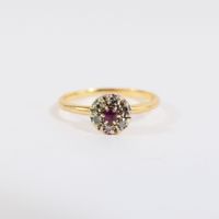 Fine bague fleur en or 750 mil. centrée d'un rubis rond dans un entourage de diamants taille 8/8, travail français (TDD : 46) (diamètre : 5,9 mm environ) (tout petit éclat sur le rubis, salissure). 1,2 g. brut