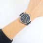 LACO. Montre-bracelet en acier, boîtier rond, cadran noir à chiffres arabes peints luminescents, mouvement automatique apparent sous un fond de boîte transparent, bracelet en cuir noir, boucle ardillon en acier, signée (diamètre : 42 mm environ) (très légères rayures d'usage).