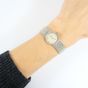 MP. Bracelet-montre de dame en or gris 750 mil., petit boîtier rond, lunette sertie de diamants taille 8/8, cadran blanc cassé, index bâton peints et appliqués, mouvement mécanique, bracelet à maille polonaise guillochée et boucle à cliquet en or gris 750 mil. (diamètre : 22 mm environ) (longueur : 16 cm environ) (légères rayures d'usages). 39,6 g. brut