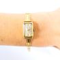 ROBY. Bracelet-montre de dame en or 750 mil., petit boîtier rectangulaire, cadran blanc cassé à chiffres arabes appliqués, mouvement mécanique, bracelet et fermoir en or 750 mil. (dimensions : 20 x 13 mm environ) (longueur : 16 cm environ) (usures au cadran, légères rayures, petits chocs). 12,3 g. brut
