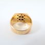Travail français des années 1940-1950. Bague chevalière 2 ors 750 mil. ornée d'un pavage de diamants taille brillant et ancienne, de roses et de corindons roses taille coussin (TDD : 59) (largeur : 12,4 mm environ) (égrisures). 13,3 g. brut