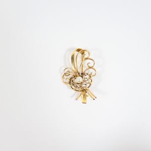 200 / 300 €Broche gerbe en or 750 mil. à décor ajouré à motif d'arabesques, ponctuée d'une perle de culture (diamètre : 5,2 mm). (Hauteur : 4,3 cm). 7,1 g.