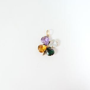 30 / 60 €Pendentif "Fleur" en or 585 mil., les fleurs ornées d'améthyste, citrine, aigue-marine et tourmaline verte. (Hauteur : 1,9 cm). 1,5 g. brut