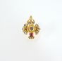 Bague en or 750 mil. ciselé à décor rayonnant sertie de diamants taillés en rose et ponctuée d'un cabochon de rubis. Travail indien. (TDD : 49). 10,6 g. brut