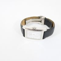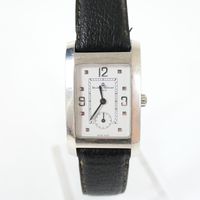 BAUME & MERCIER, Hampton. Montre-bracelet d'homme en acier, boîtier rectangulaire, cadran blanc avec index, chiffres arabes, chemin de fer et petite seconde à 6H, mouvement quartz, sur bracelet en cuir noir usagé à boucle déployante papillon en acier. Signée et numérotée. (Dimensions : 42 x 24 mm).