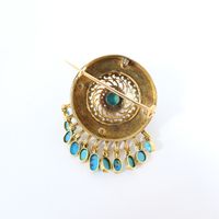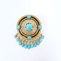 Broche rosace en or 750 mil. en partie ajourée et ciselée, soulignée d'émail noir, rehaussée de roses, ornée et retenant en pampilles des cabochons de turquoises. Travail français du XIX ème siècle, Epoque Napoléon III. (Pas de vis probablement pour transformation). (Hauteur : 4 cm environ). (Usures, 1 rose manquante, manques à l'émail). 10,3 g. brut