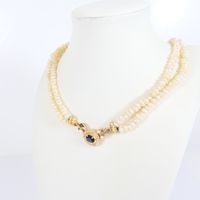 Collier de deux rangs de perles de cultures baroques, fermoir et motif amovible en or 750 mil. ornée d'une racine de saphir dans un entourage de pierres blanches imitations. (Longueur : 44 cm environ). 41,6 g. brut