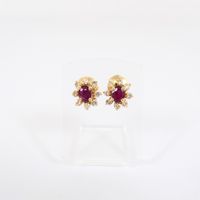 Paire de boutons d'oreilles "Fleurs" en or 750 mil. chacun centré d'un rubis taille ovale dans un entourage de diamants brillantés. (Systèmes Alpa). (Hauteur : 1 cm). 3,2 g. brut