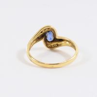 Bague tourbillon deux ors 750 mil. centrée d'un saphir ovale dans un entourage de diamants taille ancienne. (Largeur : 1,2 cm environ) (TDD : 55). 2,6 g. brut.