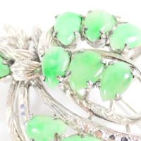 Broche en métal argenté à décors floral serti de pierres décoratives vertes. (Longueur : 5,5 cm environ ; largeur : 3,5 cm environ). 12,1 g. brut.