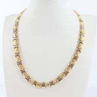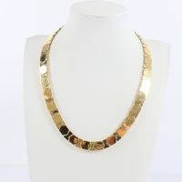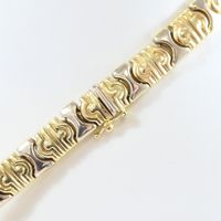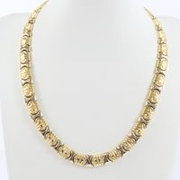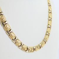 Collier deux ors 750 mil. à maille parenthèse. Fermoir cliquet avec huit de sécurité. (Longueur : 42,5 cm environ ; largeur : 1 cm environ) (salissures). 40,7 g. brut.