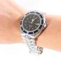 OMEGA "Seamaster", en acier ; boîtier tonneau, cadran rond à lunette tournante, fond noir à index peints. Guichet dateur à 3 h. Aiguilles luminescentes. Mouvement mécanique à remontage automatique. Bracelet en acier à fermoir déployant, signé. (Diam : 42 mm environ ; Bracelet 18 cm environ)