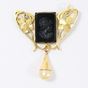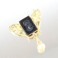 Pendentif en or 750 mil à décor floral, centré d'un camée sur onyx représentant un soldat casqué et retenant une perle imitation en pampille. Travail français d'époque Art Nouveau. (Longueur : 4,5 cm environ ; Largeur : 4 cm environ) (manque 1 anneau de suspension, l'autre ouvert) (chocs). 8,2 g brut.