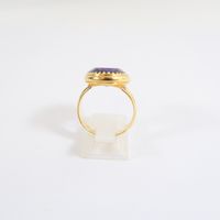 Bague en or 750 mil. à chaton ovale sertie d'une améthyste (dimensions du chaton : 2,1 x 1,6 cm) ((TDD : 57) (usures). 8,2 g. brut.