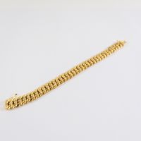 Bracelet en or 750 mil. à maillons gourmette US avec huit de sûreté (manques) (longueur : 20 cm environ, largeur : 1,3 cm). 28 g.