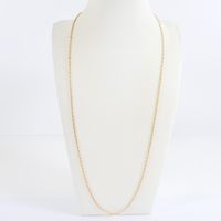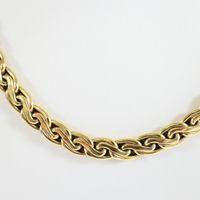 Lot en or 750 mil. : collier à maillons fantaisie (longueur : 45 cm), collier à maillons forçat limé (longueur : 67 cm) (usures, fermoir accidenté), épingle (roses) (déformations). 37,5 g. brut.