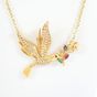 UNOAERRE. Collier en or 750 mil. à maillons forçat rond limé retenant un oiseau tenant une fleur dans son bec, pavé de diamants taille 8/8 (rubis, saphir, émeraude) (longeur : 46 cm, motif : 5,7 x 5,8 cm). Signé. 20,1 g. brut.