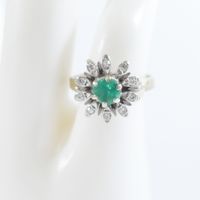 Bague fleur en or gris 750 mil centrée d'une émeraude accidentée et égrisée, entourée de diamants 8/8 dans un chaton navette (TDD : 47,5). 3,8 g brut.
