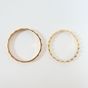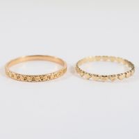 2 Anneaux dont un en or 750 mil. guilloché (TDD : 53,5) (largeur : 1,8 mm environ) (1,2 g.) et un en or 375 mil. à décor de cœurs (TDD : 51) (largeur : 1,9 mm environ) (0,7 g.). 1,9 g.