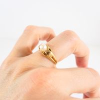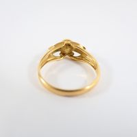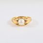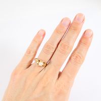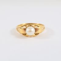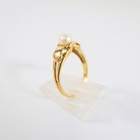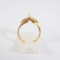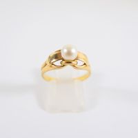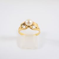 Bague en or 750 mil. à décor géométrique centrée d'une perle de culture (TDD : 55) (diamètre perle : 5,2 mm environ). 3 g. brut
