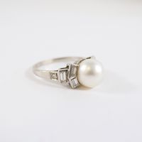 Bague en platine 850 mil. centrée d'une perle de culture et épaulée de diamants taille baguette et 16/16 (TDD : 55,5) (diamètre perle : 8,9 mm environ) (traces de mise à taille, légère déformation). 5,5 g. brut