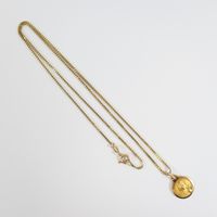 Lot en or 750 mil. composé d'une chaîne à maille vénitienne (longueur : 50,5 cm environ) et d'une médaille religieuse représentant la Vierge Marie et la Basilique de Lisieux (diamètre : 13 mm environ). 6,3 g.