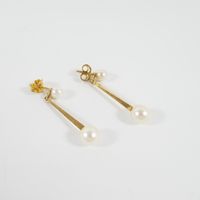 Paire de pendants d'oreilles en or 750 mil. sertis de perles de culture (diamètres : 4,7 et 6,7 mm) (longueur : 3,3 cm). 2,8 g. brut.
