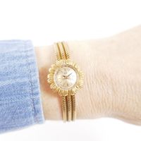 POP. Bracelet-montre de dame en or 750 mil., boîtier rond "fleur" (diamètre : 21,5 mm), la lunette à pétales, le cadran champagne à index bâtons, mouvement mécanique, sur bracelet souple en or 750 mil. tressé à fermoir cliquet (longueur : 17 cm environ). 23,4 g. brut.