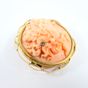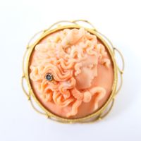 Broche-pendentif médaillon en or 375 mil. ornée d'un camée sur corail peau d'ange sculpté d'un profil féminin probablement Léda et le cygne, ponctué d'un diamant taillé en rose, dans un entourage ajouré à décor de fils torsadés. Epingle et bélière en or 585 mil. (Diamètre : 3,6 cm). 13,7 g. brut
