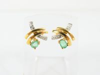 Paire de boutons d'oreilles 2 ors 750 mil. à décor de lignes entrecroisées, chacun orné d'une émeraude taille ovale. (Hauteur : 1,2 cm environ). 2,3 g. brut