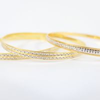 Suite de 3 bracelets joncs 2 ors 750 mil. à décor gravé de rosaces. (Tour de poignet : 21 cm ; Diamètre : 7 cm). 34,5 g.