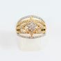 Bague ajourée en ors de couleur 585 mil composée d'un motif central losangique et de lignes rehaussés de diamants (TDD : 55; Larg centrale 1,5 cm). 6,8 g brut.