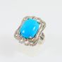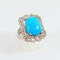 Bague en argent 800 mil centrée d'un cabochon de pierre bleue dans un entourage ajouré de pierres imitation (TDD : 60). 9,8 g brut.