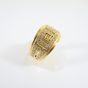 Bague bandeau en or 750 mil. à décor ajouré de frise grecque serti de pierres imitation (TDD : 54,5) (largeur : 12,6 mm environ) (égrisures, déformation). 11 g. brut