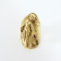 Bague en or amati 750 mil. à décor de femme nue serti d'un rubis taille navette et de diamants taille 8/8, travail français, traces de date et de signature (TDD : 59 environ) (dimensions : 3,5 x 2,2 cm environ) (petits éclats au rubis). 30,3 g. brut