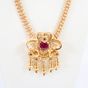 Collier en or rose 750 mil. à maille fantaisie retenant un motif à décor ajouré de volutes, de fleurs et de pampilles, serti de pierres imitation rouges, travail portugais (longueur : 45,5 cm environ) (hauteur motif : 5,9 cm environ). 42,1 g. brut