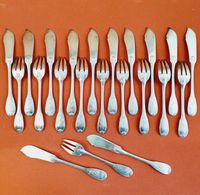 ARGENTAL, années 30 : Suite de 12 couteaux et 10 fourchettes à poisson en métal argenté modèle godrons et lambrequins. Poinçon de maître à la hallebarde. Rayures d'usage.