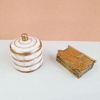 Boîte ronde couverte en laiton doré et plaques de nacre (H : 8,5 cm ; Diam. : 7 cm) et Boîte "Livre-Atlas" en bronze doré aux attributs du géographe (H : 2,3 cm ; L : 8,7 cm ; P : 5,2 cm).