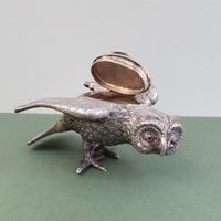 Chouette en bronze argenté formant boîte, à plumes ciselées, les yeux en verre. H : 6 cm ; L : 14 cm ; Larg : 8,2 cm. Usures.