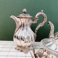 Service à thé-café de 4 pièces quadripodes de la fin du XIX ème en argent 950 mil. minerve à décor de côtes melonnées et enroulements feuillagés comprenant : - Théière, frétel bouton de rose, poinçon de maître Edmond BONNESOEUR (actif 1887-1908), - Cafetière et pot à lait, frétel gland, poinçons de maître Martial FRAY (actif 1849-c. 1861), - Sucrier couvert, frétel bouton de rose, poinçon de maître PAUL MASSAT (actif 1877-1885). Poids brut : 2728,6 g.