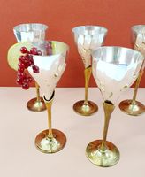 Suite de 6 verres tulipes à pieds vintage années 70 en métal argenté et laiton doré, le buvant à côtes torses. Hauteur : 21,5 cm. Dans leur écrin en velours violet.