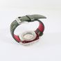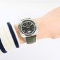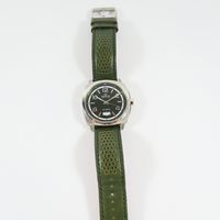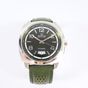 MARVIN. Montre-bracelet en acier, boîtier de forme coussin (diamètre : 42 mm), cadran kaki, chiffres arabes et index épi appliqués, guichet dateur à 6H, mouvement automatique apparent sous un fond de boîte transparent, bracelet en cuir kaki et rouge, boucle ardillon siglée en acier (légères rayures d'usage).