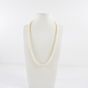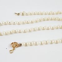 Collier de perles de culture (Diam : 6 mm en moyenne), fermoir ajouré en or 375 mil, lamelle et chaîne de sécurité en or 750 mil (Long : 52 cm environ). 23,9 g brut.