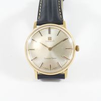 Montre d'homme en or 750 mil sur bracelet cuir usagé, boîtier rond (Diam : 34 mm), cadran argenté taché à index bâton, TISSOT, Seastar Seven, mouvement mécanique (verre rayé, petits chocs, remontoir rapporté usé, chiffrée). 42,1 g brut.