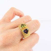 Bague bandeau godronnée en or 750 mil. ornée de deux cœurs affrontés sertis d'une améthyste et d'un péridot. (TDD : 52,5) (Pierre cassée). 8,9 g. brut.